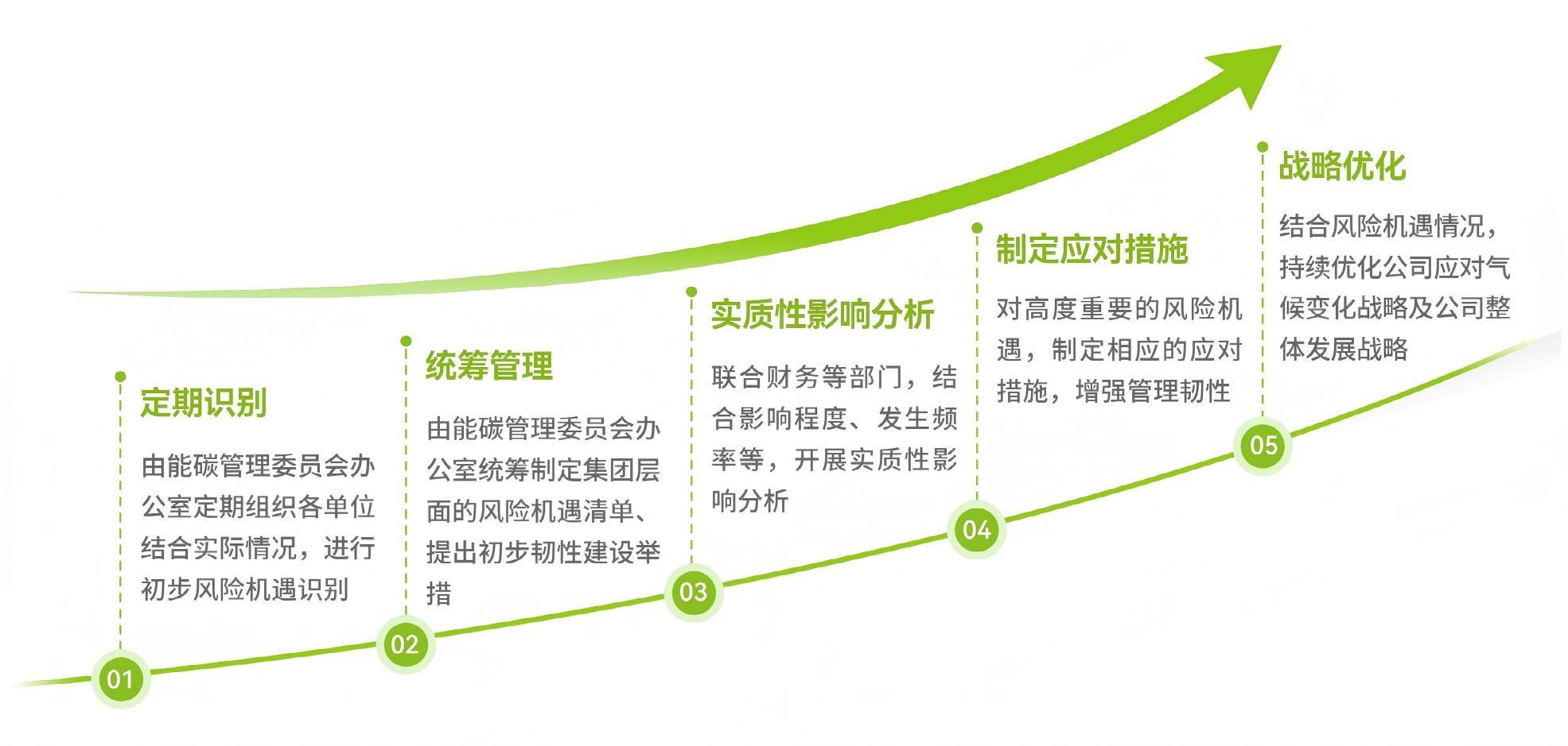 公司基于识别出的气候风险与机遇制定应对策略,以能源(碳)管理委员会为领导,定期跟踪气候相关行动和计划进展,对温室气体减排目标开展年度考核,并持续探索优化气候相关风险和机遇管理的工作机制。
