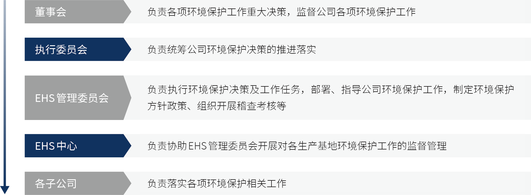 董事会作为公司运营及环保管理的最高领导机构,负责各项环境保护重大决策,监督各项环境保护工作;董事会下设执行委员会,负责统筹环境保护工作的推进落实。环保管理委员会在董事会、执行委员会的领导下,负责执行各项环境保护决策及工作任务,部署、指导公司环境保护工作,制定环境保护政策方针、组织开展环境保护稽查考核等。
