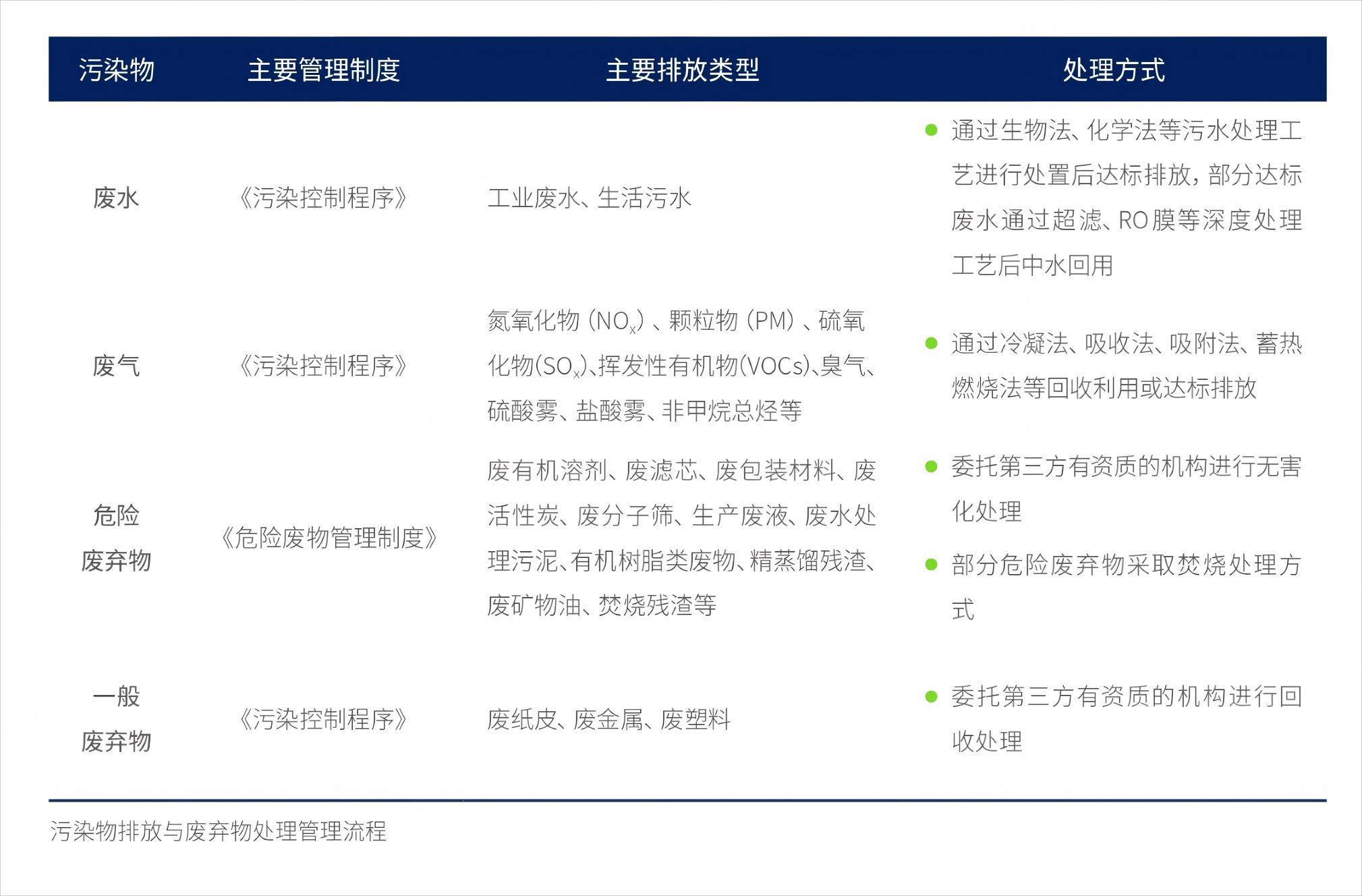 公司严格管控生产运营过程中的污染物排放与废弃物处置,从源头推行绿色生产以减少污染物产生,不断优化三废管理与治理,确保各项污染物达标排放及废弃物合规处置。公司针对建设、生产运营过程中的污染物排放和废弃物处置制定了完善的内部流程,包括《污染控制程序》《危险 废物管理制度》《固体废弃物分类办法》等,2025年内修订了《环境保护规范化管理工作指南(试行》,系统性明确危险废物的全生命周期管控要求。