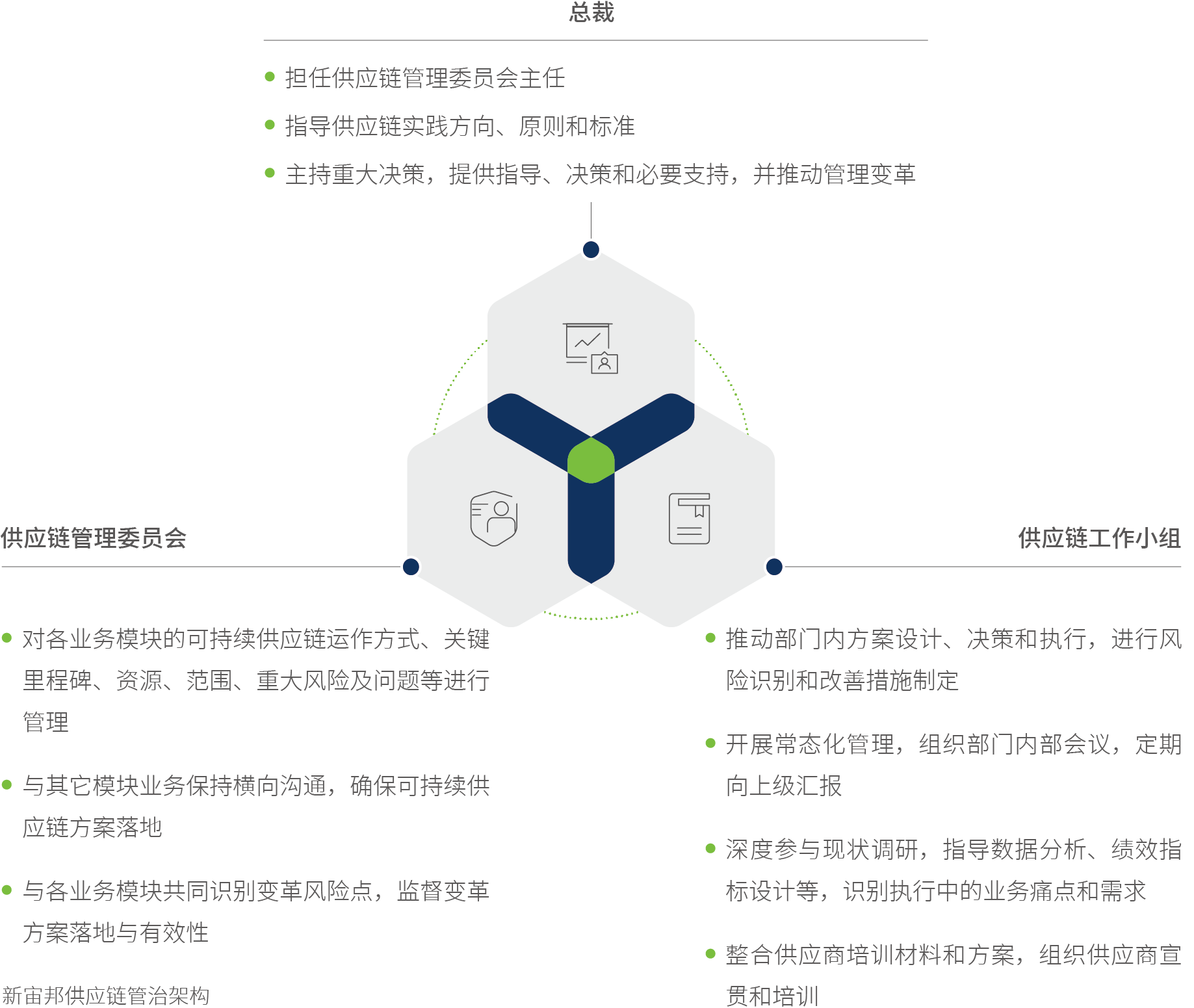 公司司建供应链三级管理架构,明确各层级职责分工,确保供应链的稳定运行和效管理。公司在采购过程中严格遵守《新宙邦供应商行为准则》,并参考《管理责任矿产供应链尽职调查流程》及最新法律法规要求,不断优化更新《管理供应商社会责任制度》《供应链尽责管理申诉制度》《新宙邦责任矿产资源供应链的尽责管理政策》《责任矿产资源尽责管理风险》《责任矿产尽责管理五步法》及《责任矿产供应链尽职调查管理表》,强化供应链的ESG管理,并确保采购全流程的合规性。